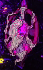 Hairess ornament made of birch plywood that has been hand painted with acrylic paint and sealed. UV reactive green color will glow in purple or blacklight!