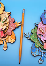 Original design telepathically transmitted from unknown cosmic sources and hand painted to its exacting chromatic specifications. Layered wood construction, 7 3/8" x 5.5".