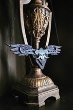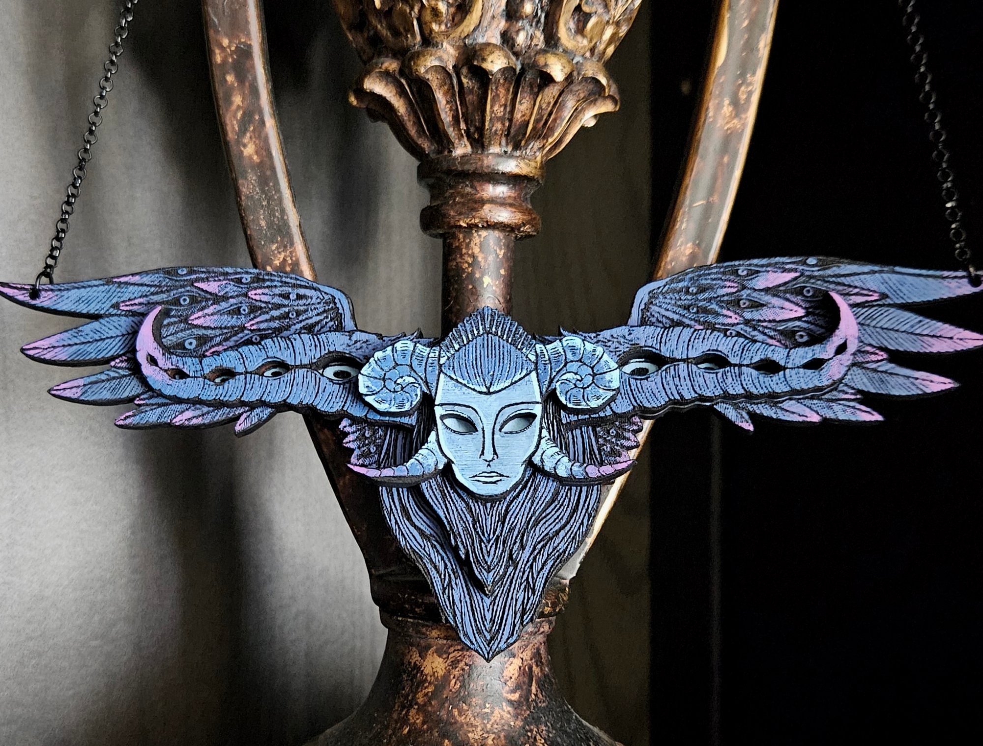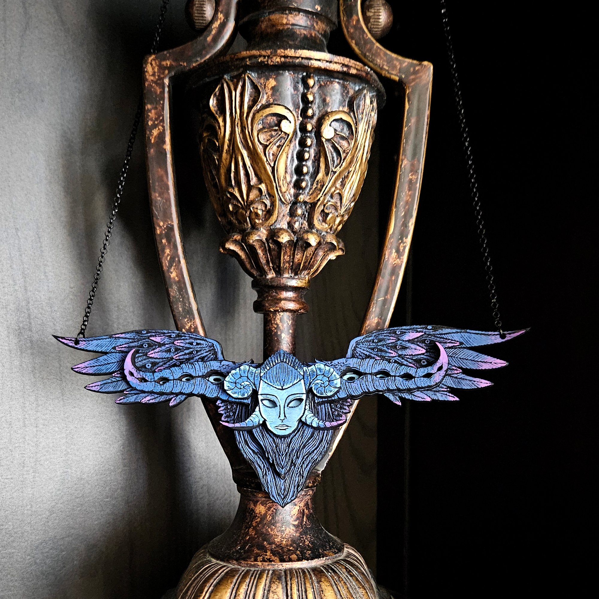 This necklace is a fan art piece dedicated to the spirit of death in the great Guillermo Del Toro's recent movie Pinocchio! The necklace measures 7" wide and 2.75" tall and is laser cut then hand painted and sealed. Each piece is made to order and may take up to a week to ship depending on my work load! Please feel free to contact me with any questions!