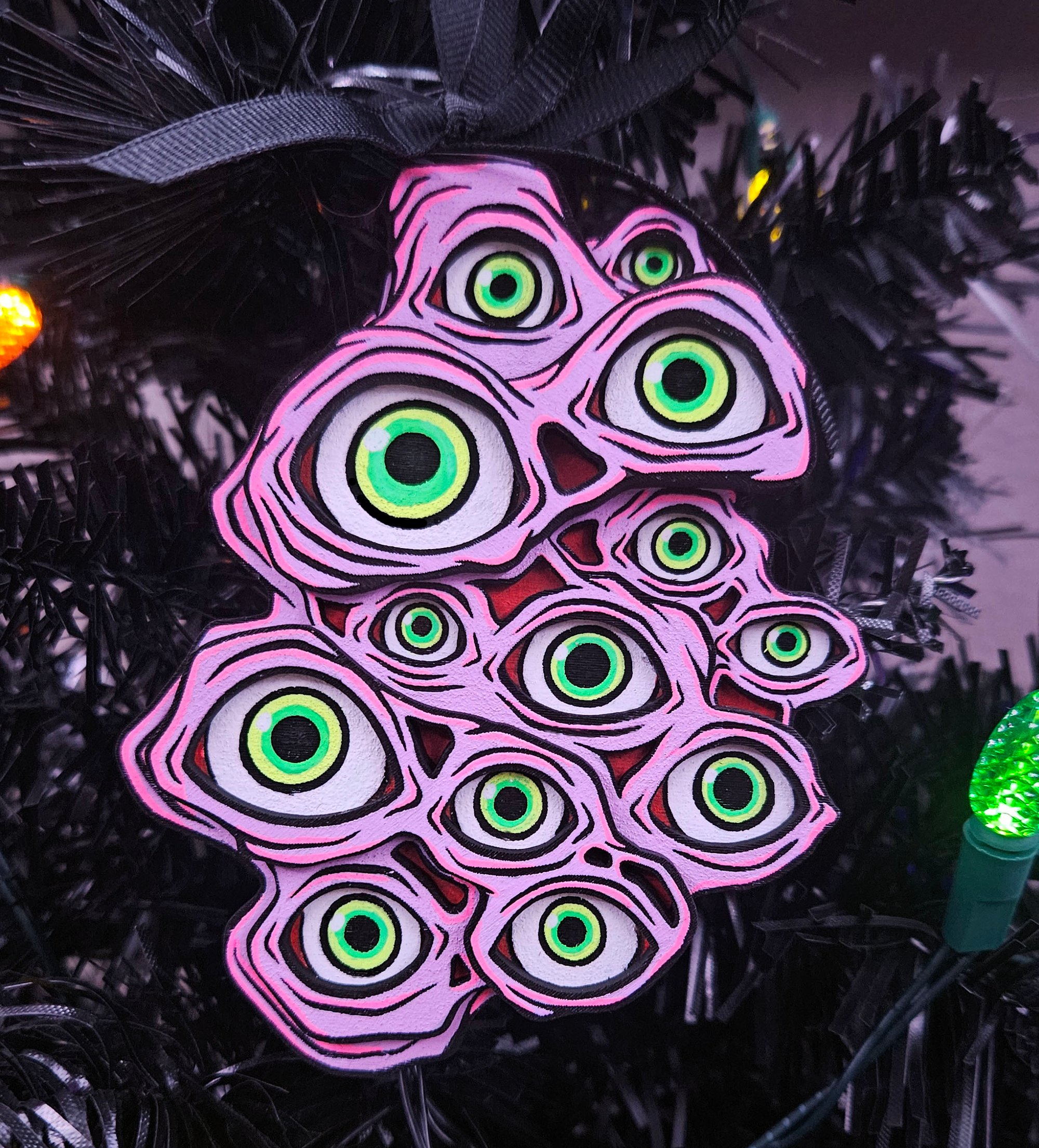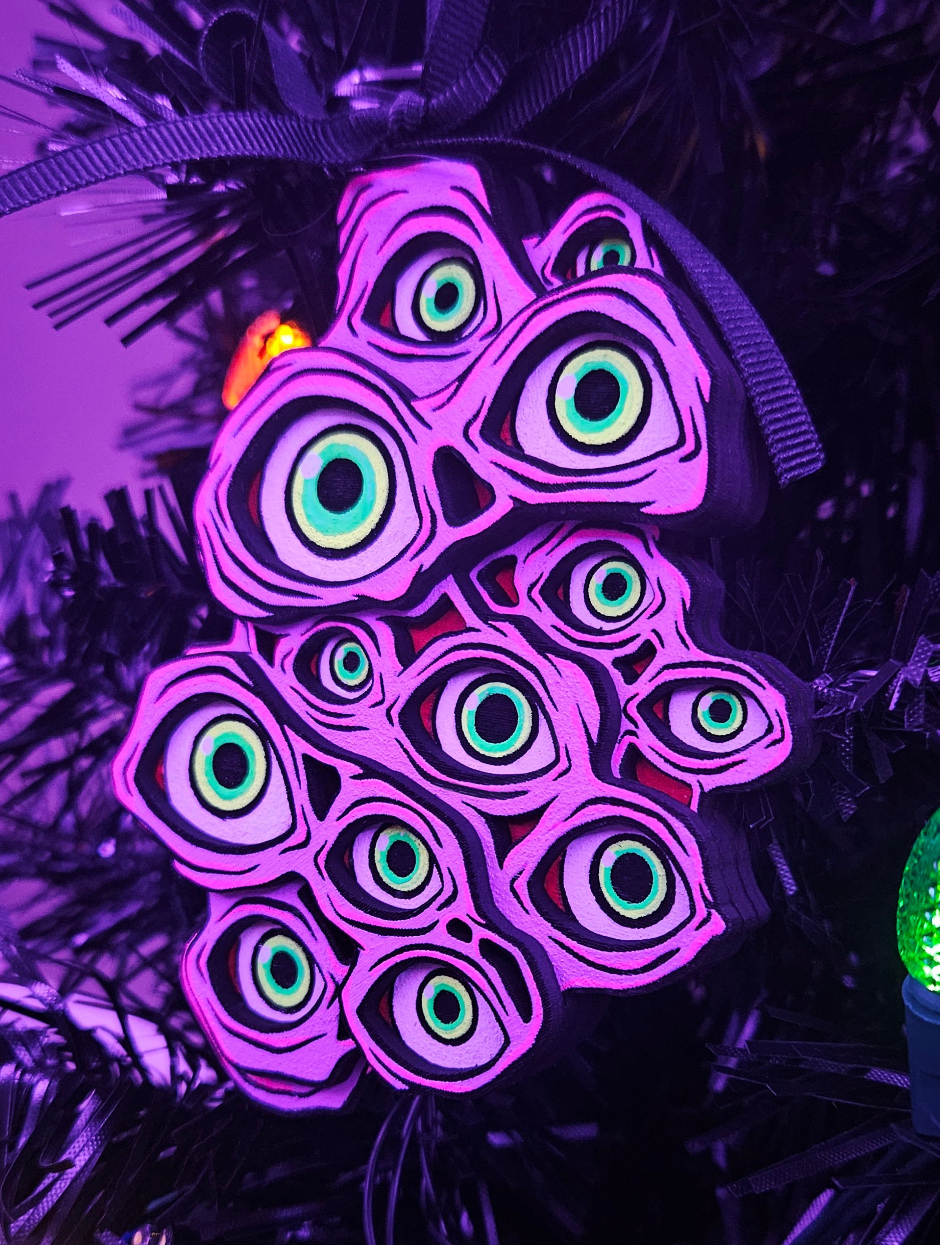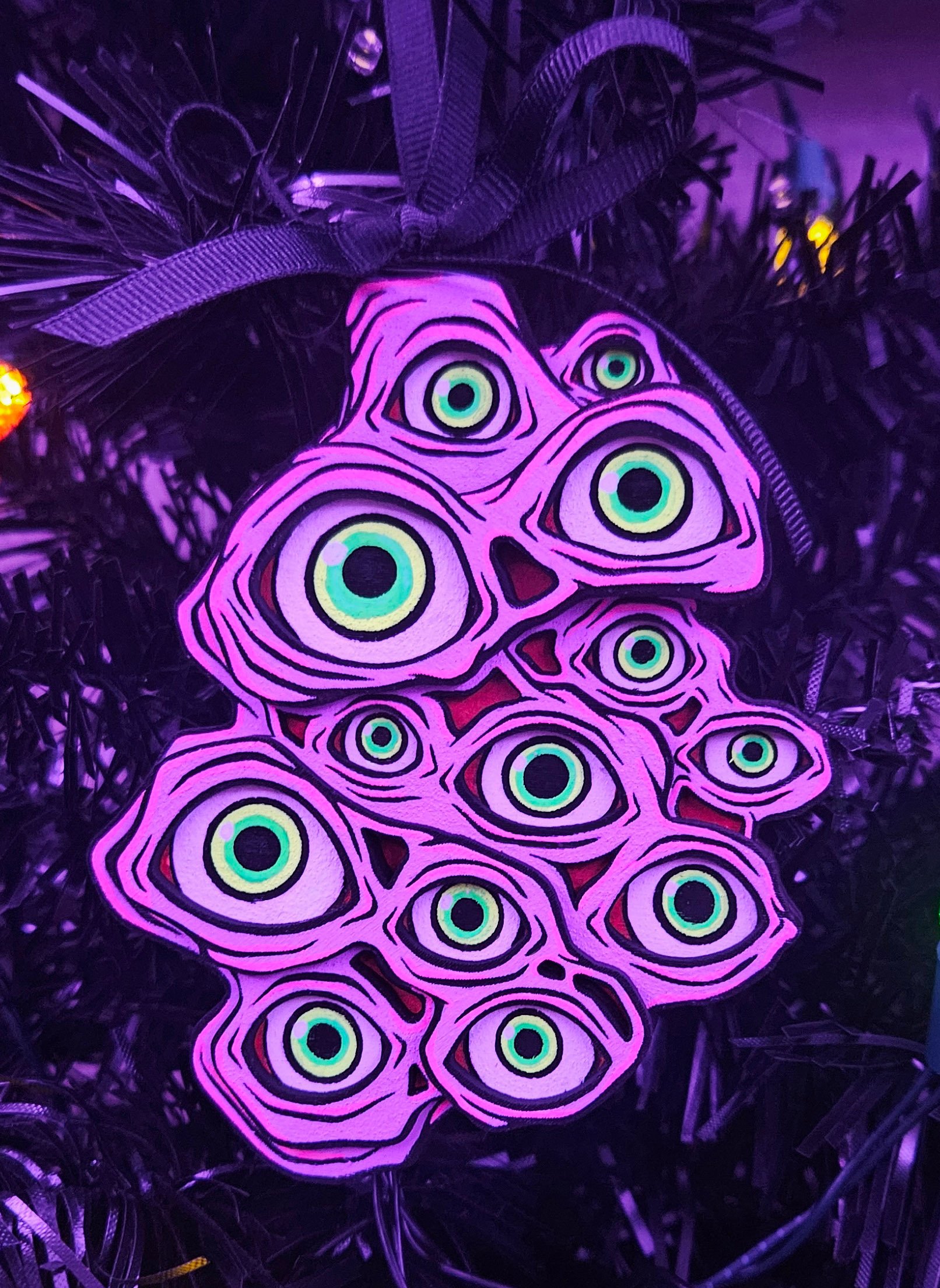 Eyes ornament made of birch plywood that has been hand painted with acrylic paint and sealed. UV reactive green color will glow in purple or blacklight!