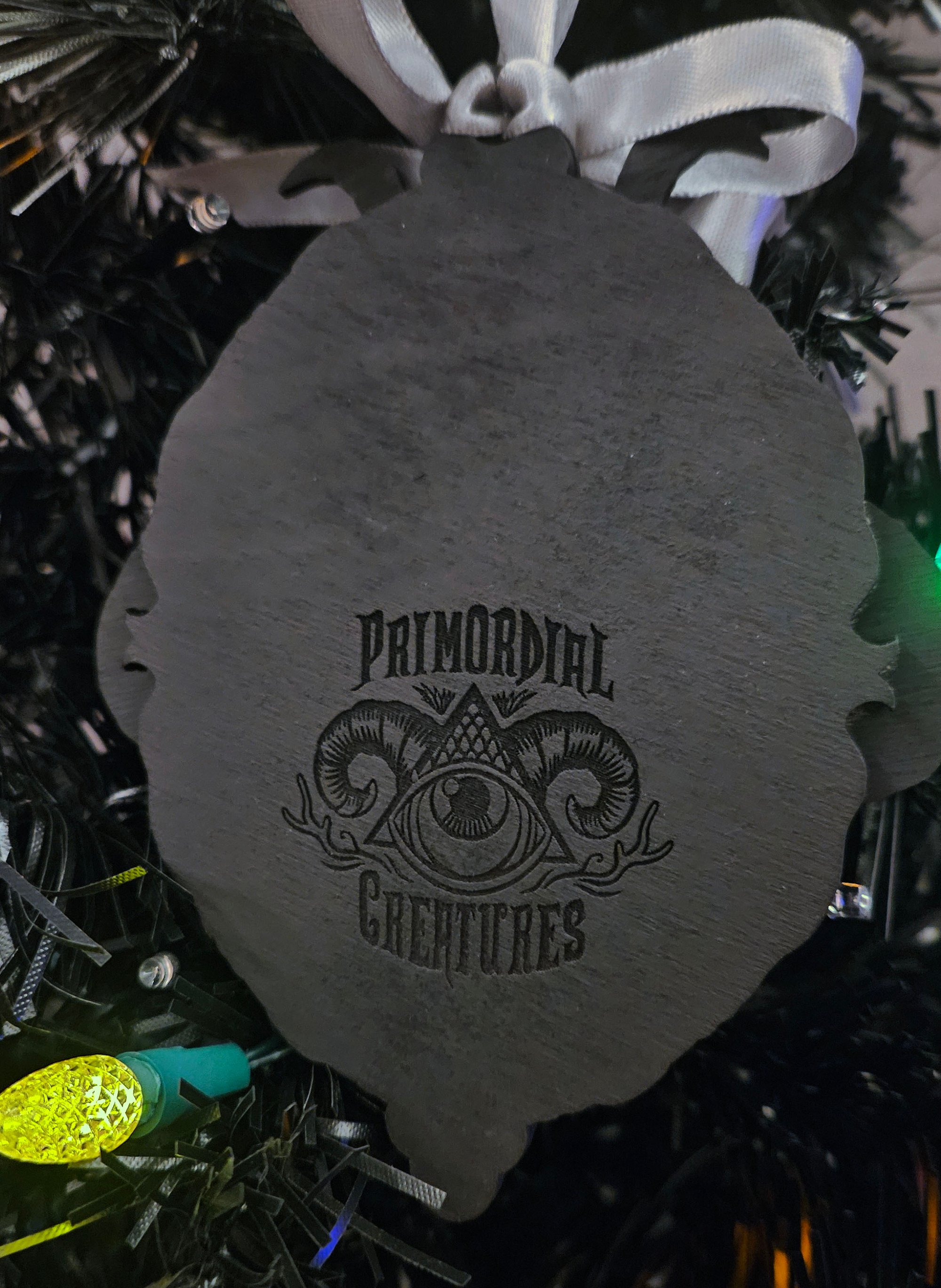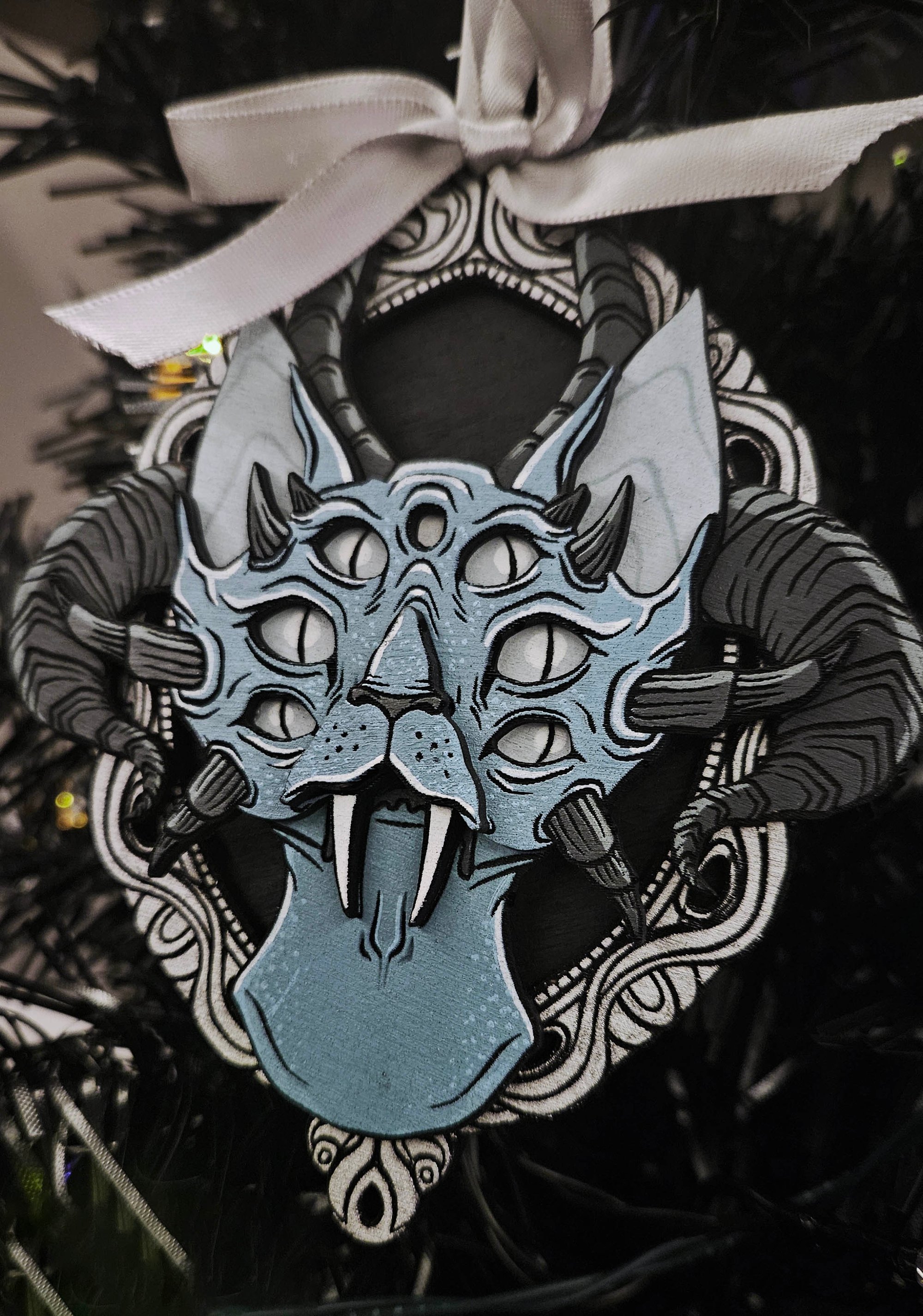 Ice Cat ornament made of birch plywood that has been hand painted with acrylic paint and sealed.