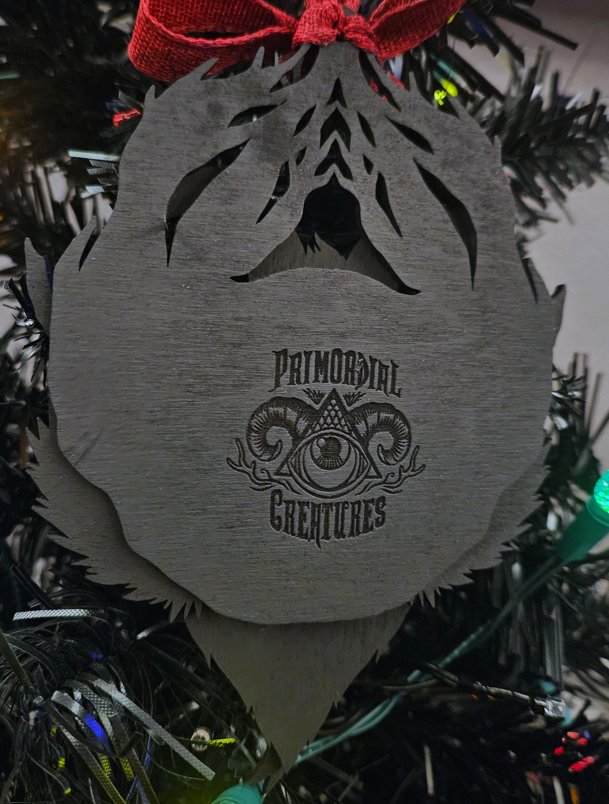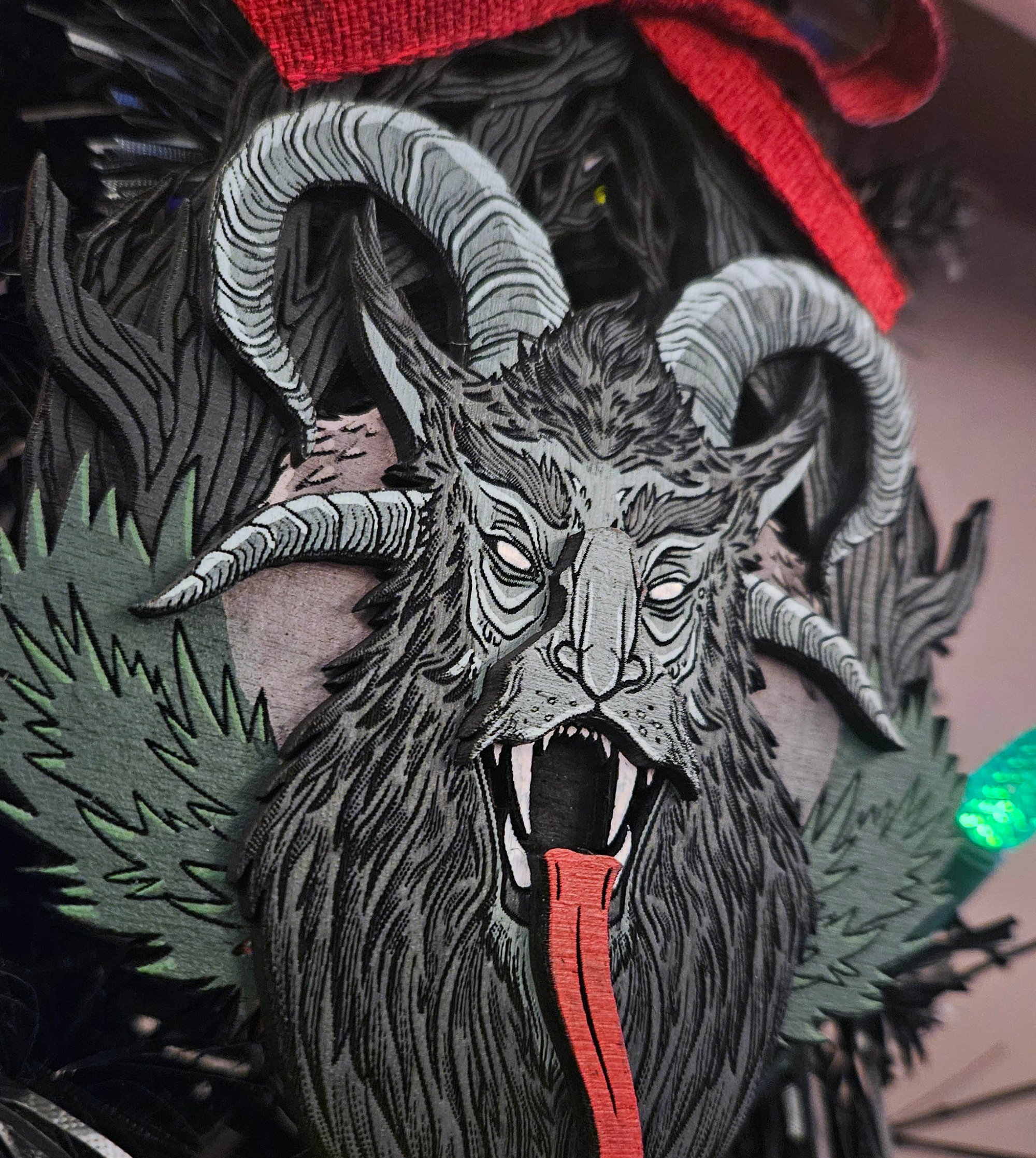 Krampus ornament made of birch plywood that has been hand painted with acrylic paint and sealed.