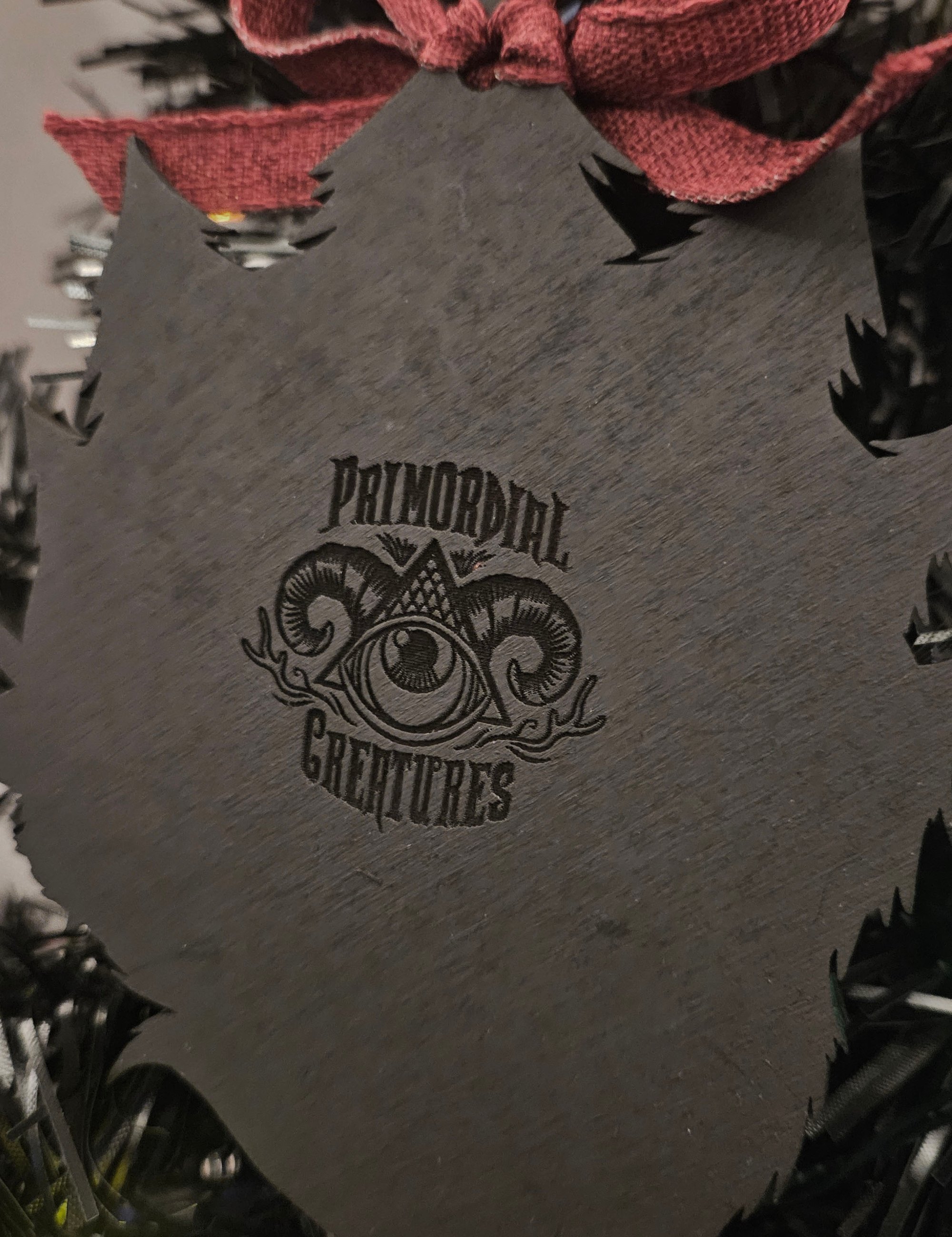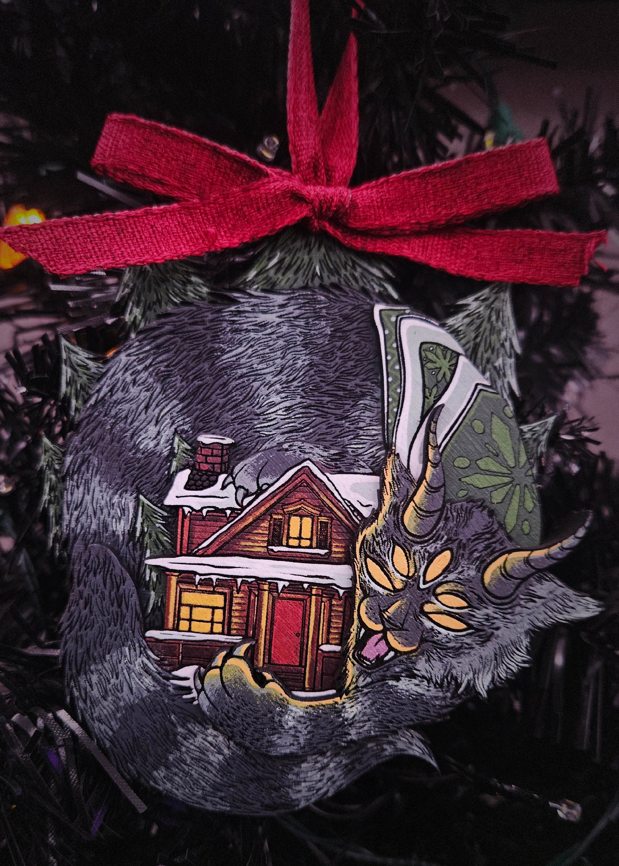 Yule Cat ornament made of birch plywood that has been hand painted with acrylic paint and sealed.